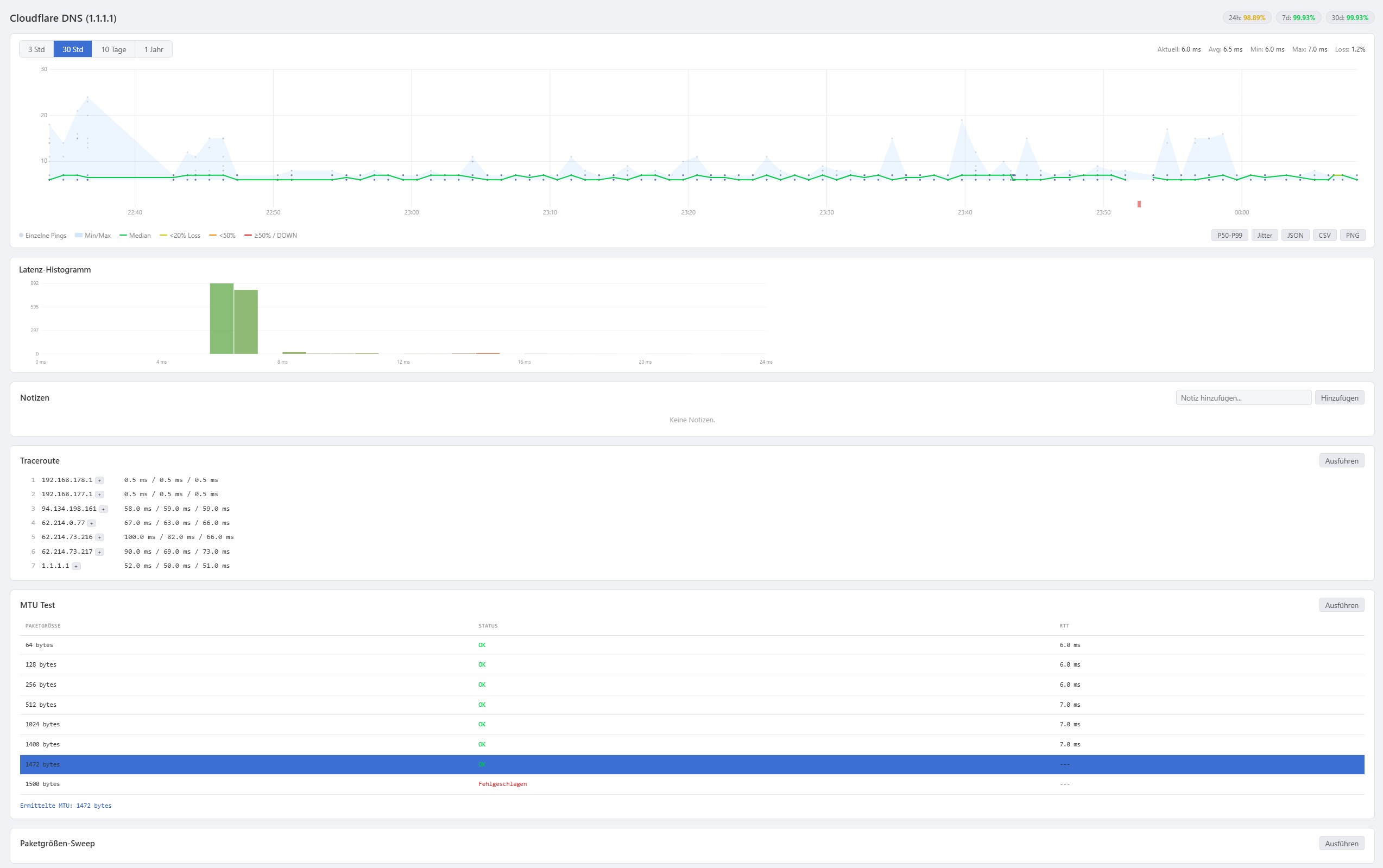 Detail-Ansicht mit Latenz-Graph, Traceroute und MTU-Test